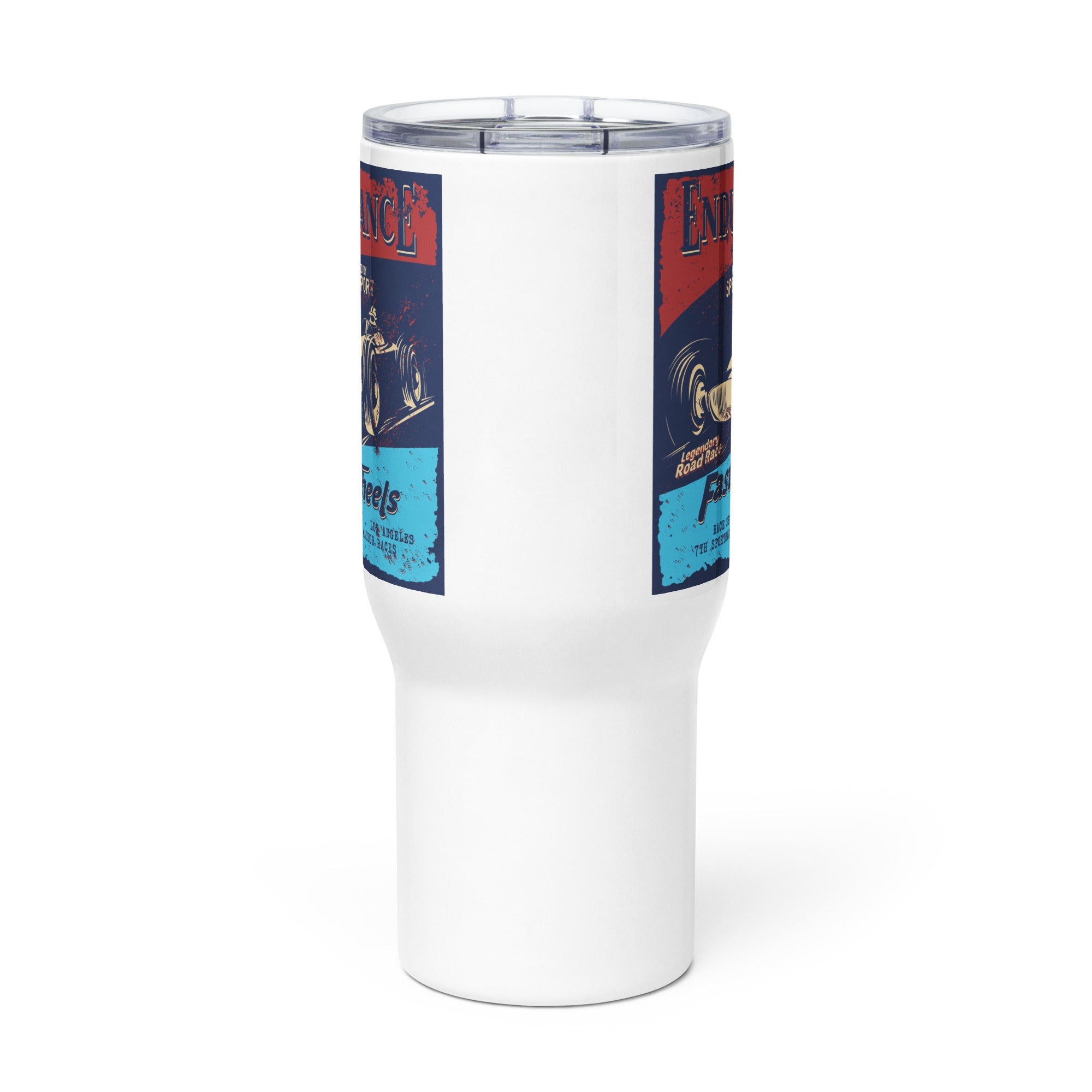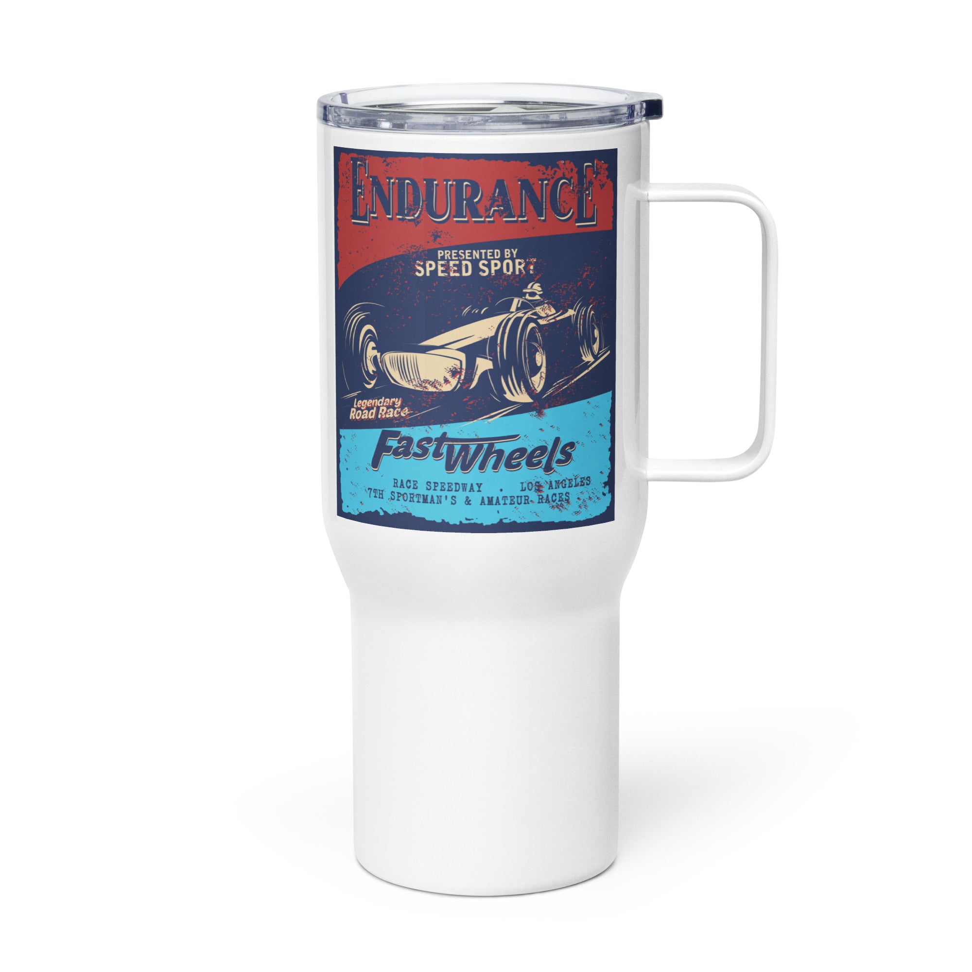 Sip in style with this retro-style race poster travel mug. It fits into most car cup holders and has a spill-proof plastic lid. Commute to work or the track —this travel mug will keep your beverage safe and at just the right temperature.
